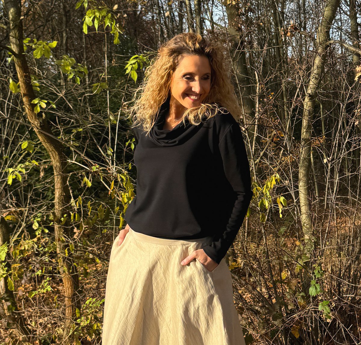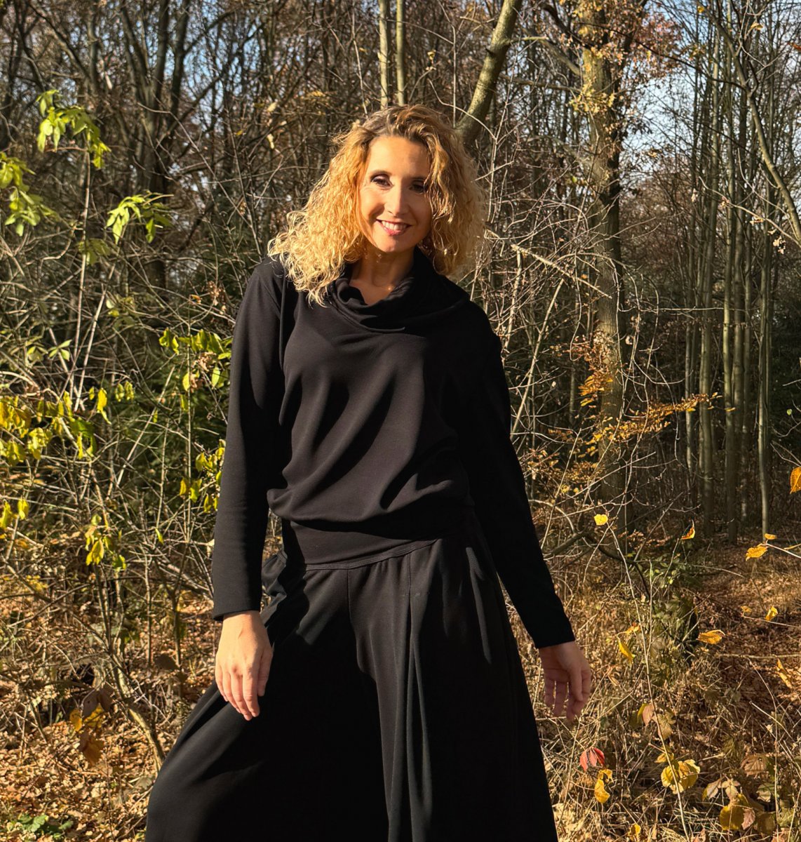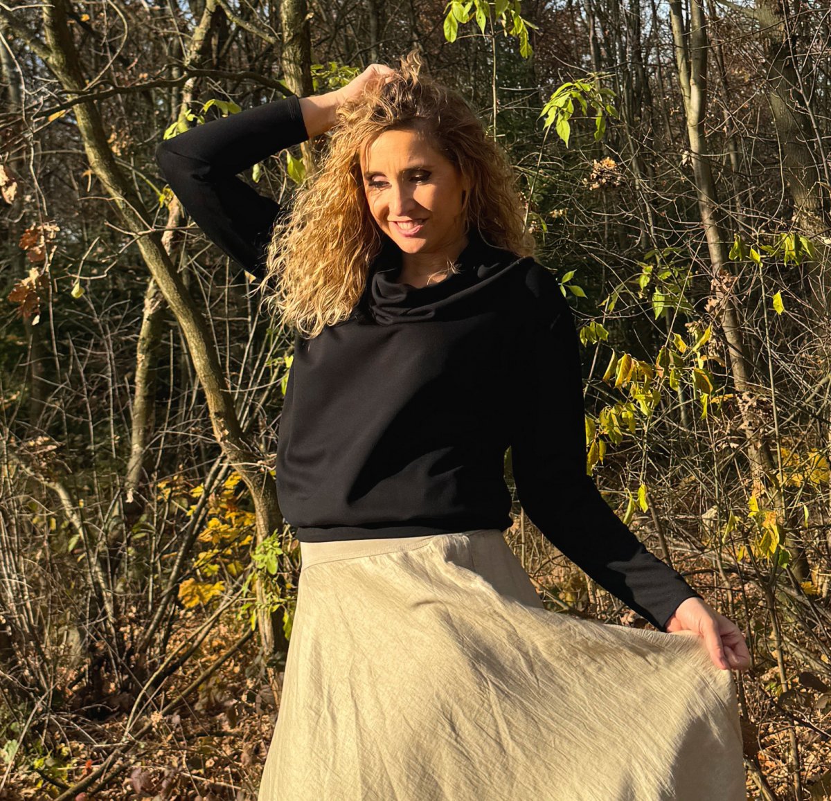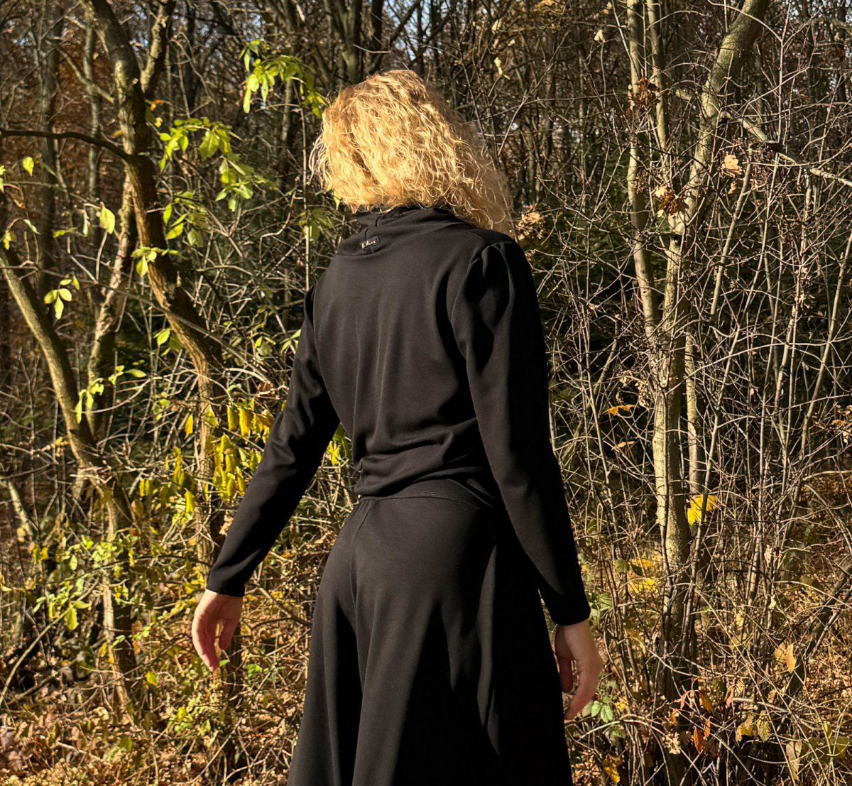 Rolák s dlouhým rukávem je ušitý ze středně silného směsového úpletu (68%vis/28%Pes/4%ela). Spodní díl je stažený do širokého pružného pasu.