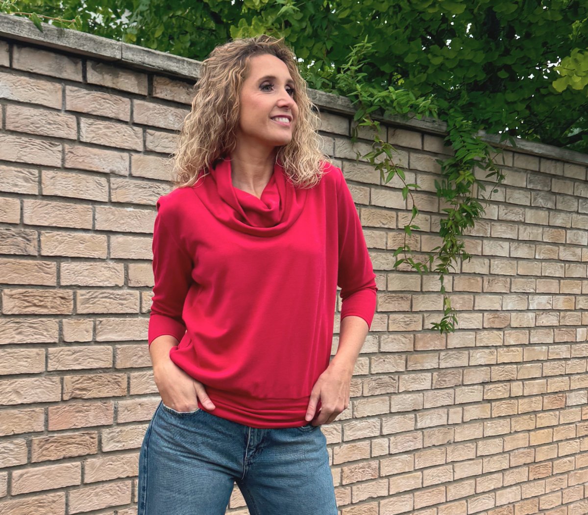 Rolák s 3/4 rukávem je ušitý ze středně silného směsového úpletu (68%vis/28%Pes/4%ela). V pase je stažený do širokého lemu.
