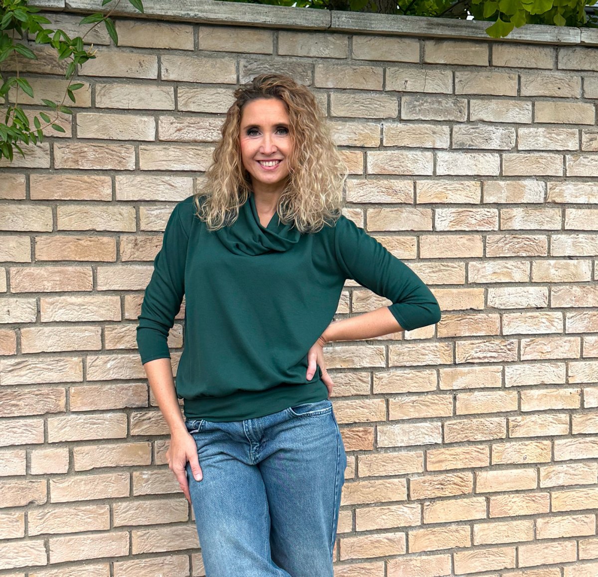 Rolák s 3/4 rukávem je ušitý ze středně silného směsového úpletu (68%vis/28%Pes/4%ela). V pase je stažený do širokého lemu.
