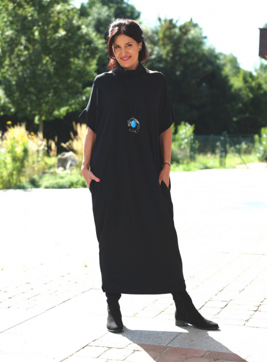 Šaty mají na ramenou prostřihy. V bočních švech jsou kapsy.