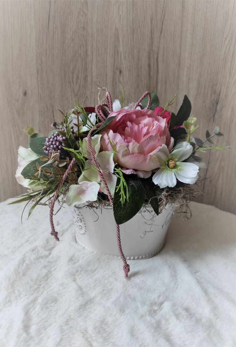 Květinové aranžmá z kvalitních látkových květin, růží, pivoněk, krásenek a hortenzie v bílé keramické misce doplněné přírodní tilandsií a látkovou a umělou zelení. Dekorace je trvanlivá a je vhodná jako krásný romantický dárek.