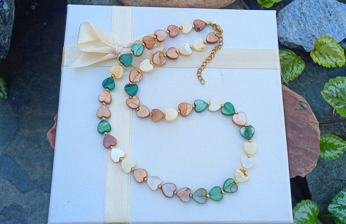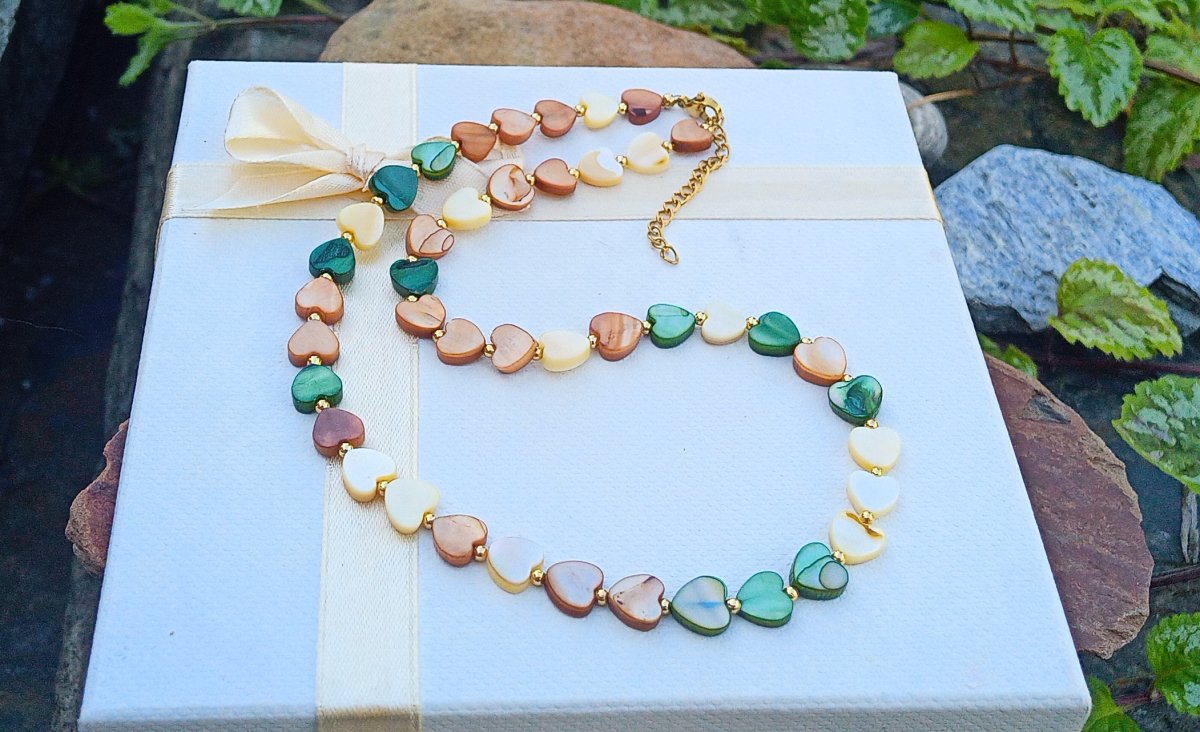 Romantický náhrdelník vyrobený z přírodní barevné dokonale lesklé perletě ve tvaru srdíček prokládaných pozlacenými korálky doplněný o prodlužovací řetízek. Perleť vyniká krásným nádherným leskem s duhovými perleťovými odlesky.