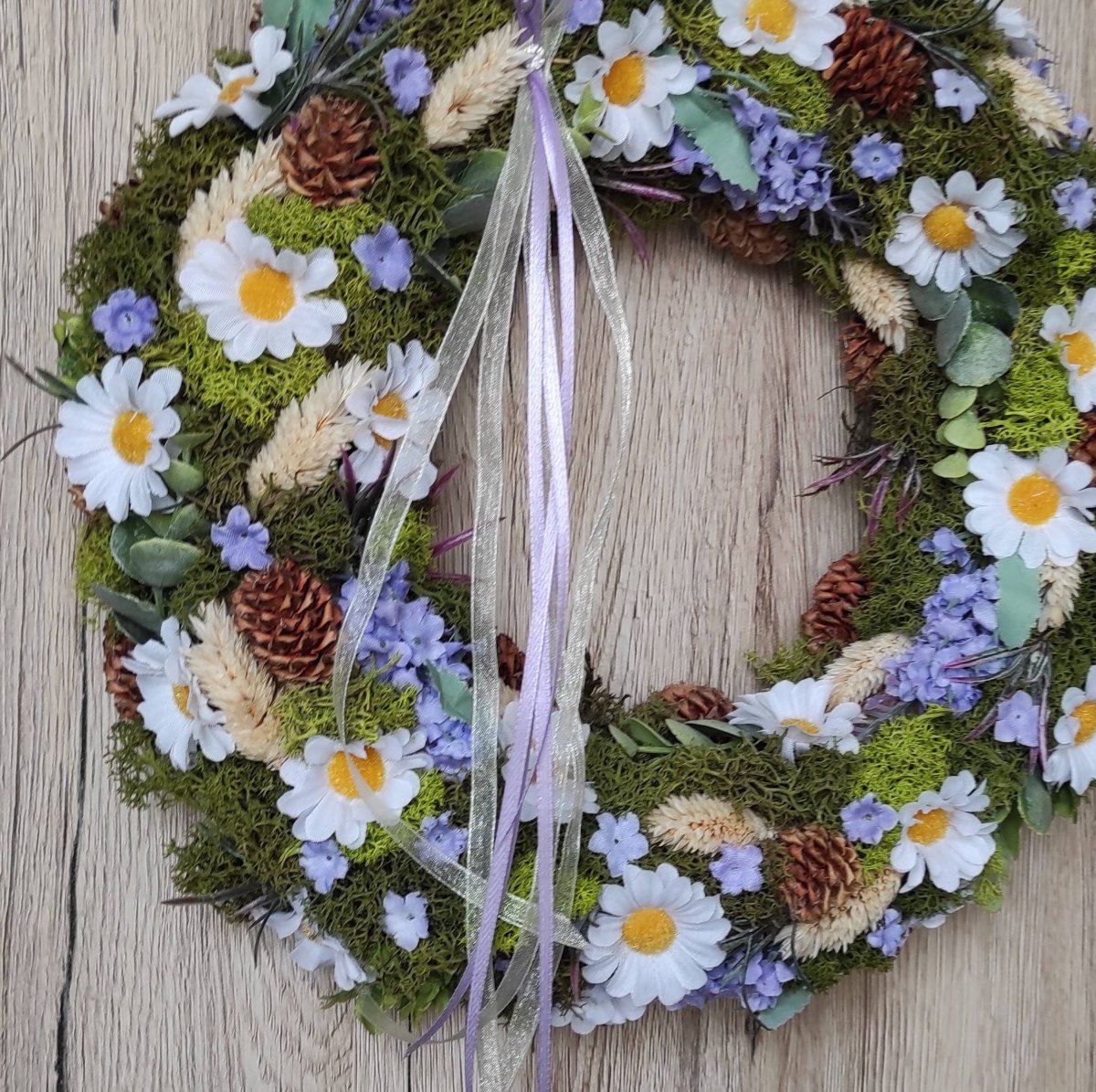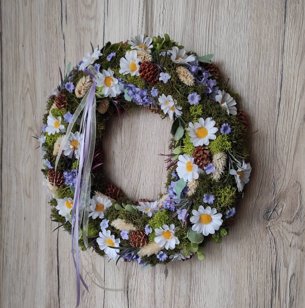 Krásný romantický věnec k zavěšení na stěnu nebo na dveře. Věnec je bohatě zdobený různými druhy suchých plodů, dovozovým stabilizovaným trvanlivým mechem, kvalitními látkovými květy kopretin, levandule a dalšími přízdobami.