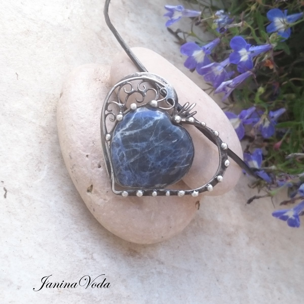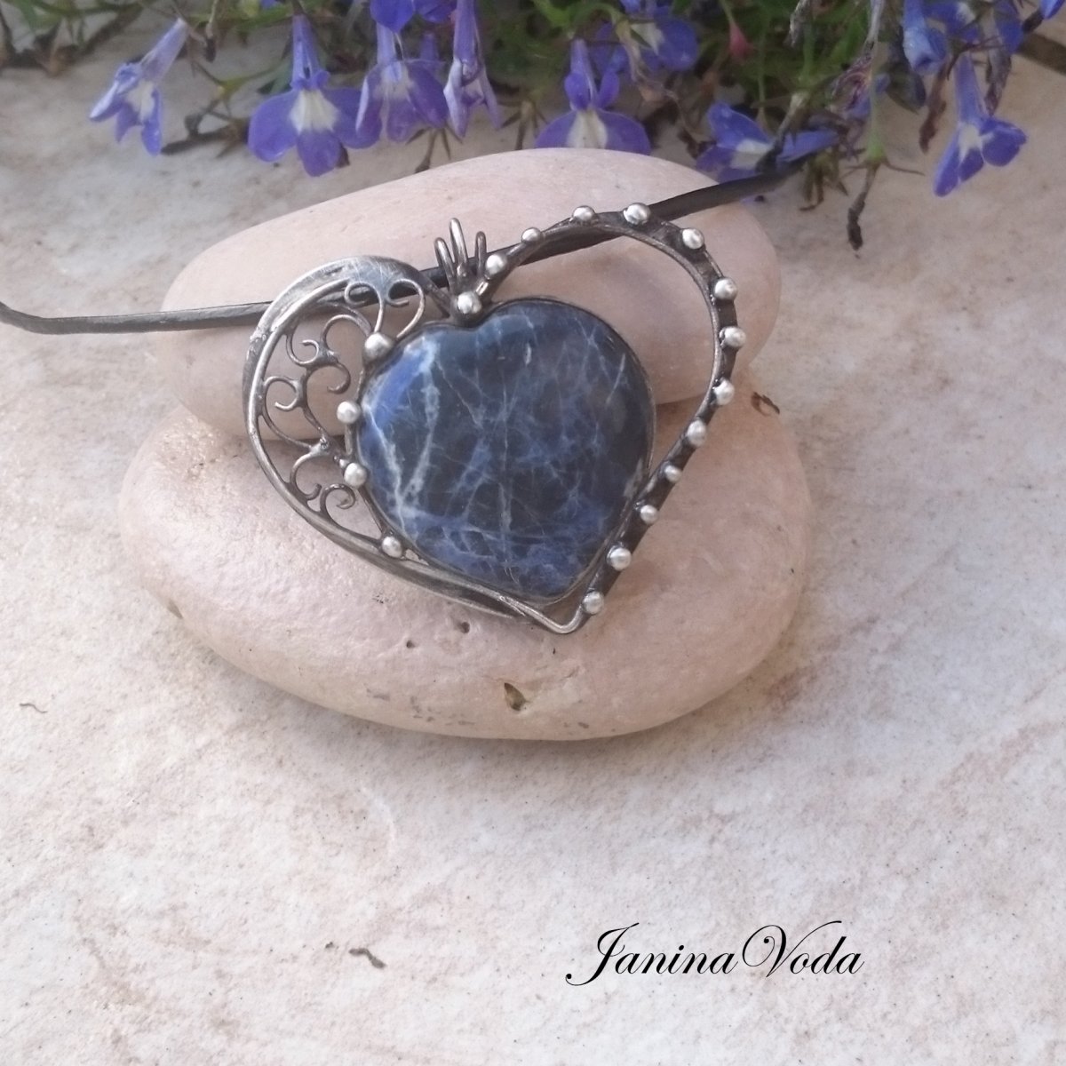 Cínovaný, patinovaný, následně leštěný náhrdelník z krásného pravidelného srdíčka sodalitu. Náhrdelník je patinovaný, leštěný a ošetřený antioxidačním přípravkem.