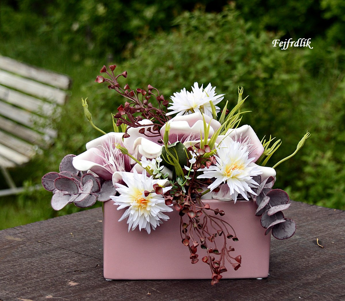 Originální dekorace v keramickém truhlíku s umělými a pěnovými květinami , zelení a umělým eukalyptusem.