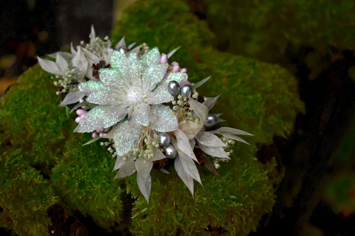 Třpytivý květ a sušené či plastové bobulky a lístky jsou připevněny na základu kovové spony.