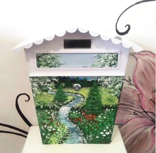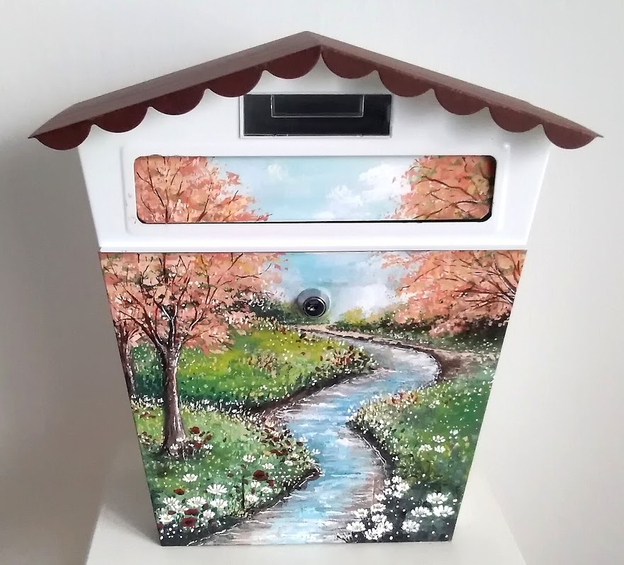 Originální poštovní schránka s ručně malovaným motivem klidné krajiny přináší do exteriéru domu příjemnou atmosféru venkova a harmonie. Motiv cesty vinoucí se zelení, stromy a jemnými květy působí uklidňujícím dojmem a krásně vynikne na světlé i tmavší fasádě. Každý kus je jedinečný originál, malovaný s důrazem na detail a barevnou vyváženost.