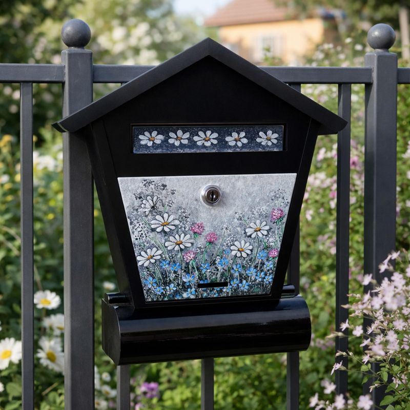 Tato dekorativní poštovní schránka není jen praktickým prvkem, ale i estetickým detailem, který vítá každou návštěvu už u vstupu do domu. Květinový motiv dodává prostoru teplo, osobitost a pocit domova.
