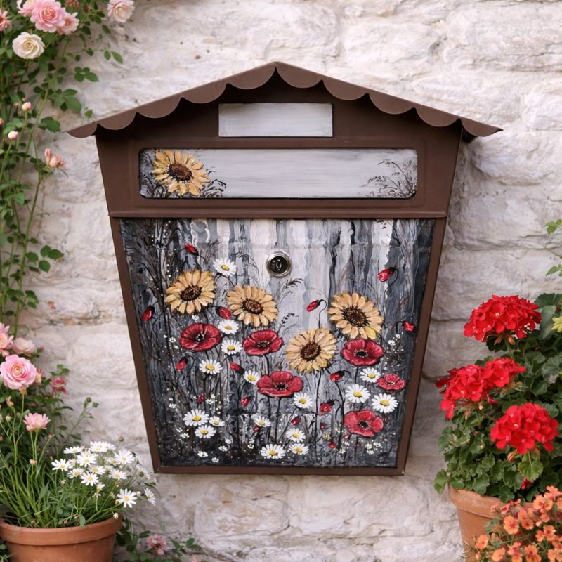 Tato ručně malovaná poštovní schránka s motivem slunečnic a lučních květů představuje originální doplněk, který okamžitě zvýrazní vstup do vašeho domu či chalupy. Každý kus je jedinečným autorským dílem – pečlivě malovaný kvalitními barvami, které jsou odolné vůči povětrnostním vlivům.