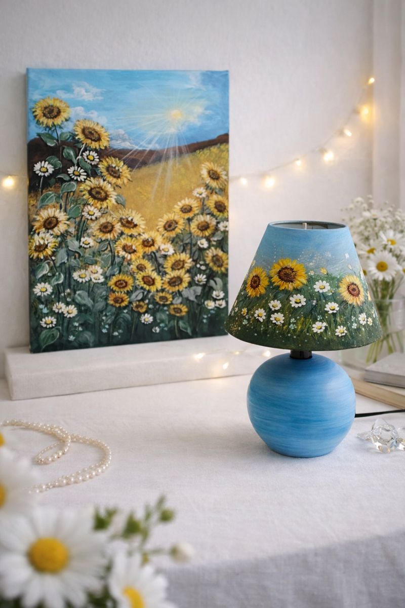 Tato ručně malovaná stolní lampička představuje elegantní spojení umění a funkčního designu. Stínidlo zdobí ručně malovaný květ v jemných pastelových tónech, který dodává lampičce luxusní a umělecký vzhled. Stabilní podstavec v ladícím modrém odstínu vytváří harmonický celek, který se hodí do moderních i klasických interiérů.