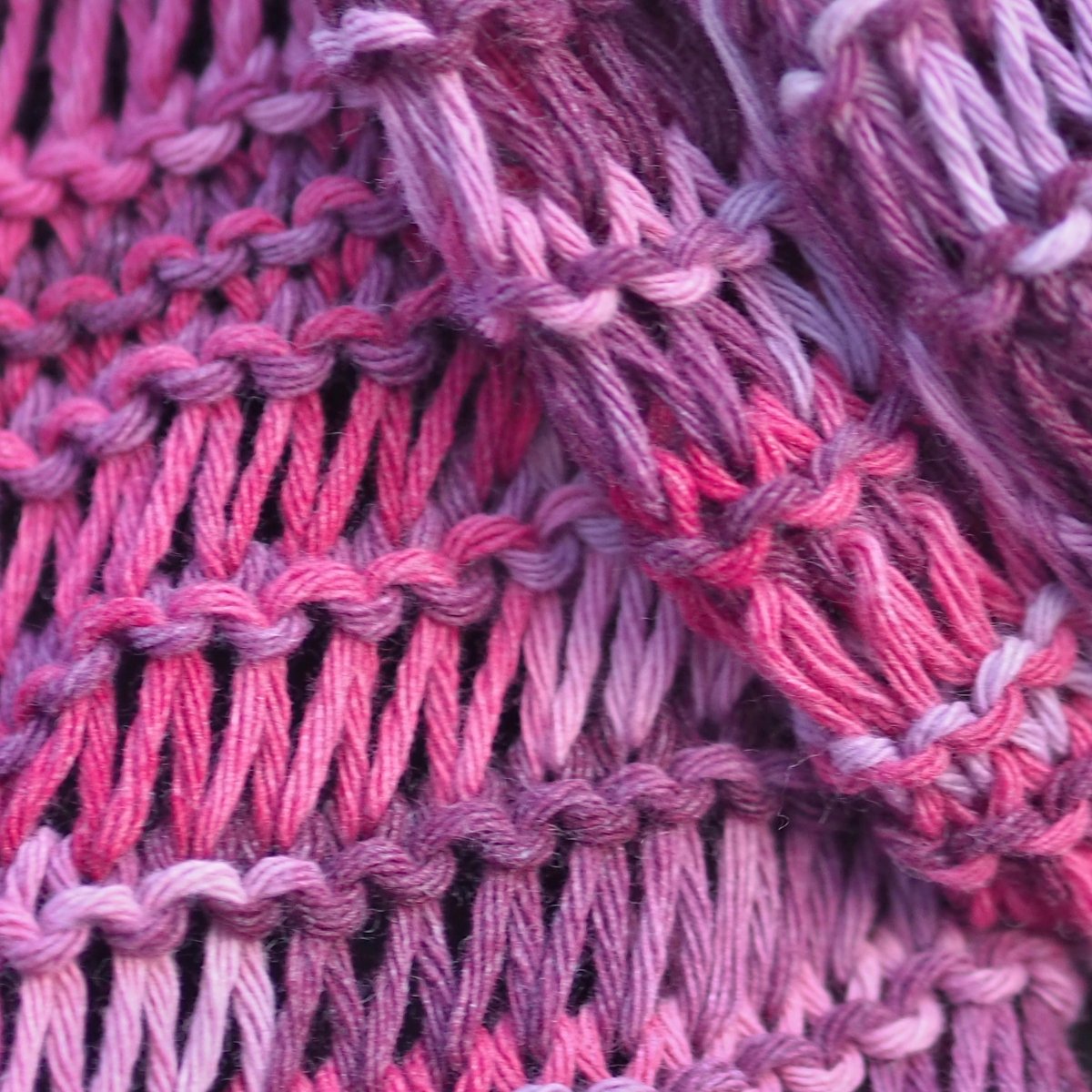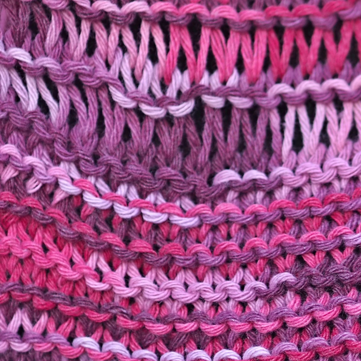 Barva - melírováná příze v odstínech purpurové,lila,světlé růžové,fuchciové.