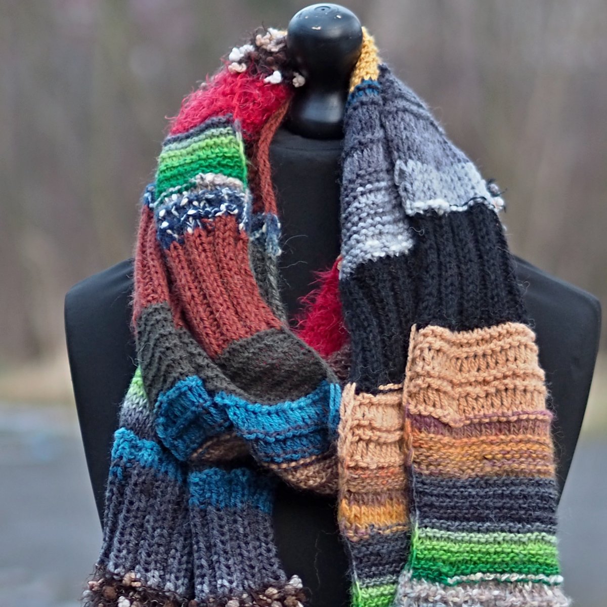 Originál vytvořený kombinací různých přízí,struktur a barevných pruhů.Najdete na šále tóny antracitové vedle hřejivé hnědé,okrové,zelenkavé i výrazné červené - viz.detailní foto.