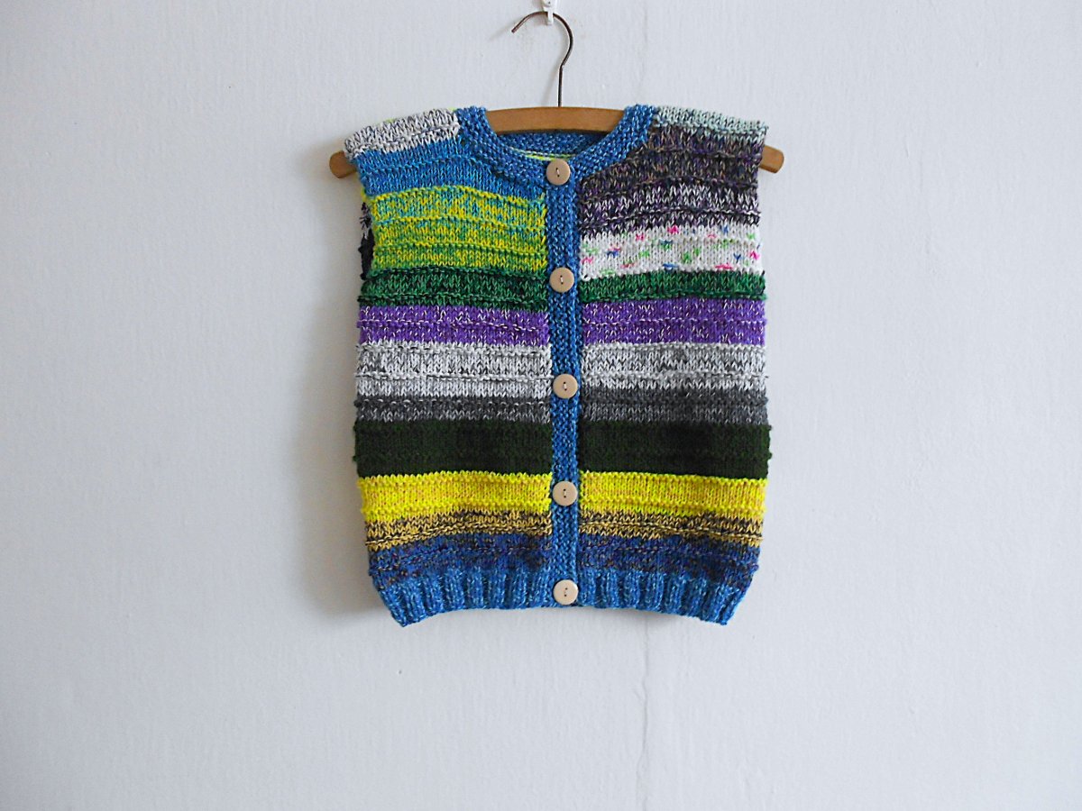 Kojenecká ručně pletená vestička, velikosti 104-110, délka 41cm, šířka 37 cm. Materiál: 60% merino, 20% akryl, 10% vlna, 10% bavlna.