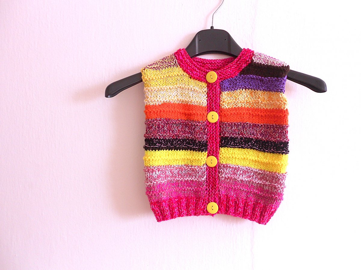 Kojenecká ručně pletená vestička, velikosti 68-74, délka 31cm, šířka 30 cm. Materiál: 40% merino, 20% akryl, 30% vlna, 10% bavlna.