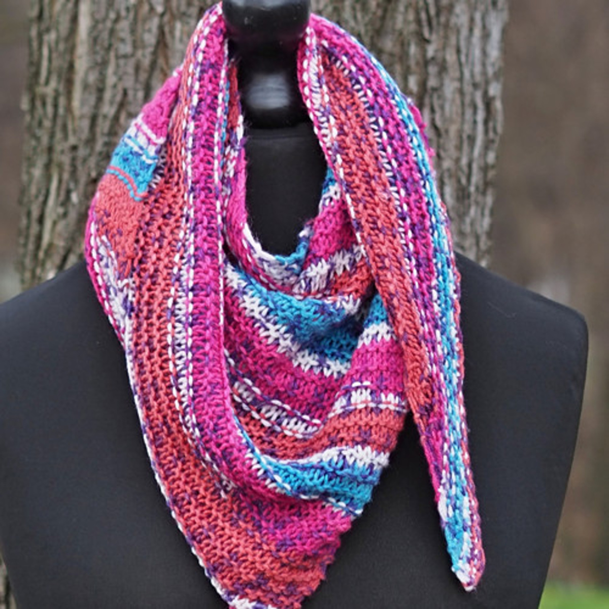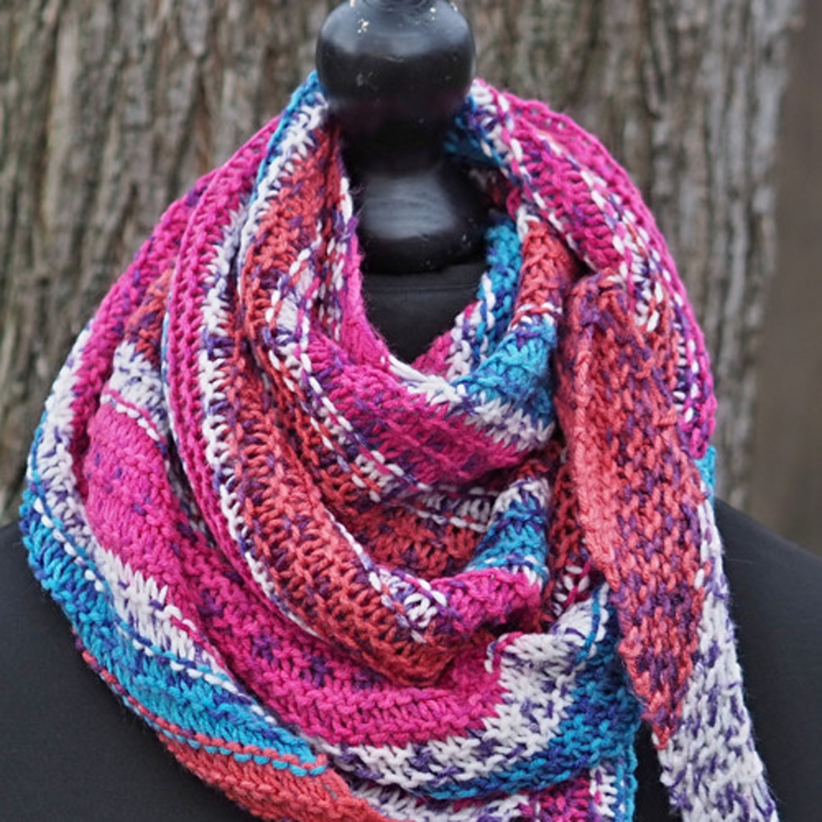 Tento originální,ručně pletený šátek je v barevné kombinaci růžové,tyrkysové,cihlové a bílé,které spolu dodávají šátku jedinečný vzhled - viz.detailní foto.