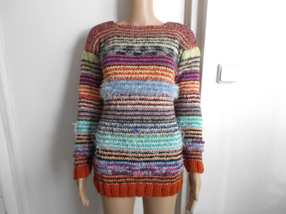 Dámský, ručně pletený, teplý svetr, velikost S,M: délka 64 cm, šířka 48 cm, vnitřní délka rukávu 46 cm. Doporučuji jemné praní a sušit volně položené.