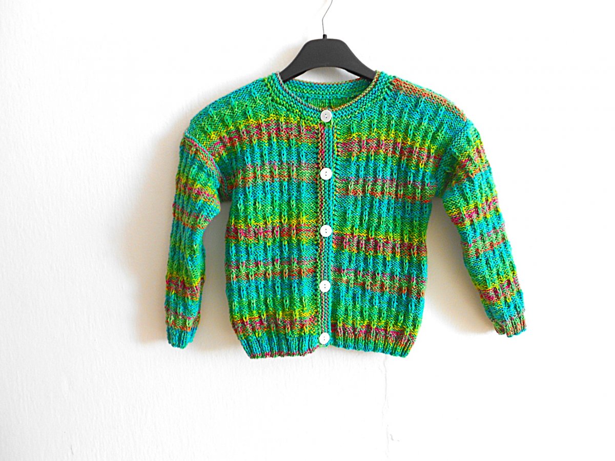 Ručně pletený svetřík, velikosti 116-122, délka 40 cm, šířka 37 cm, vnitřní délka rukávu 34 cm. Materiál: 30% merino, 40% akryl, 30% vlna.