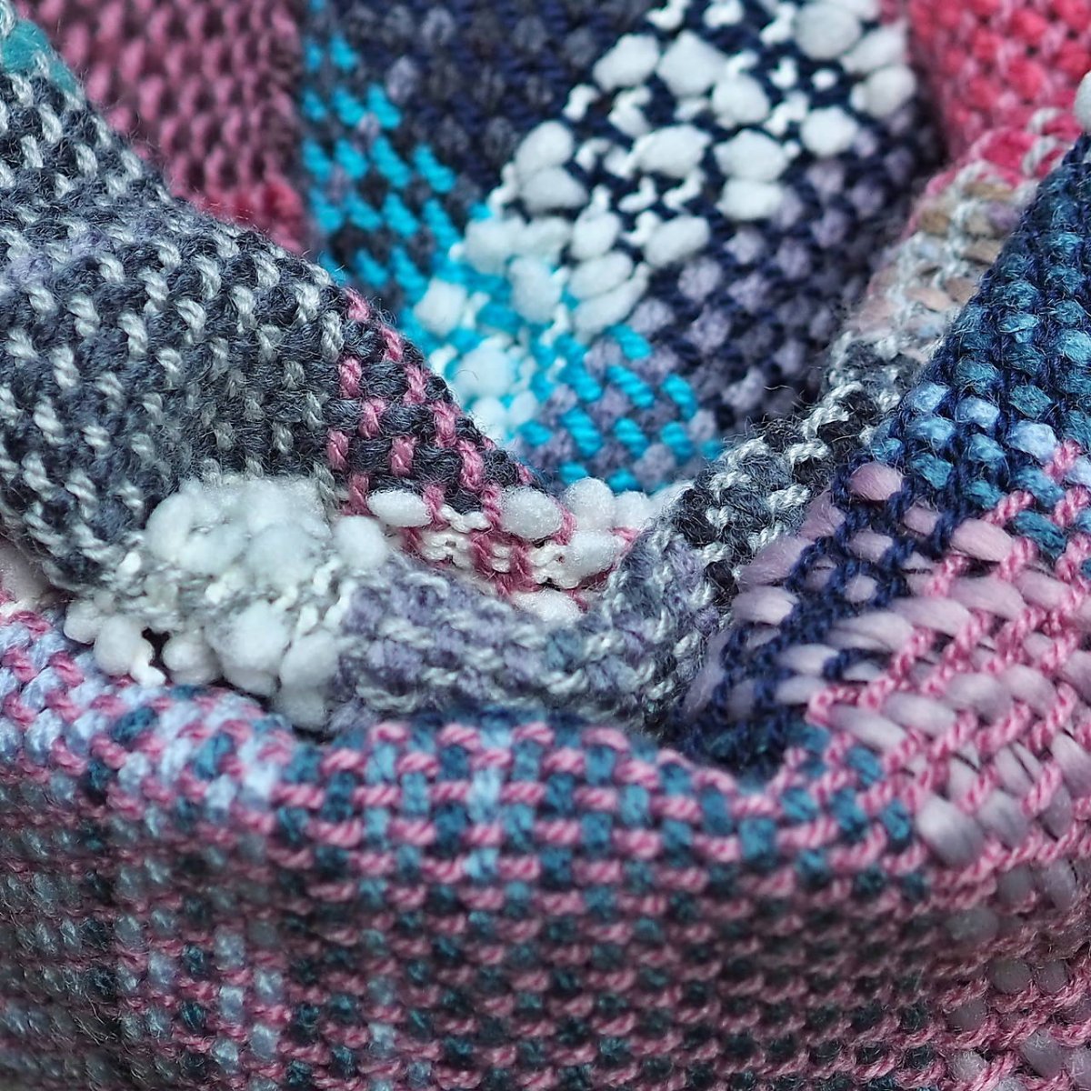 Útek - botatá textura s vícebarevným vzorem v barvě odstínu růžové,modré,tyrkysové,fialové,bílé,které jsou vytkané do nepravidelných bloků a přechodů,náhodně rozdělených efektně skanou přízí - viz.detailní foto.