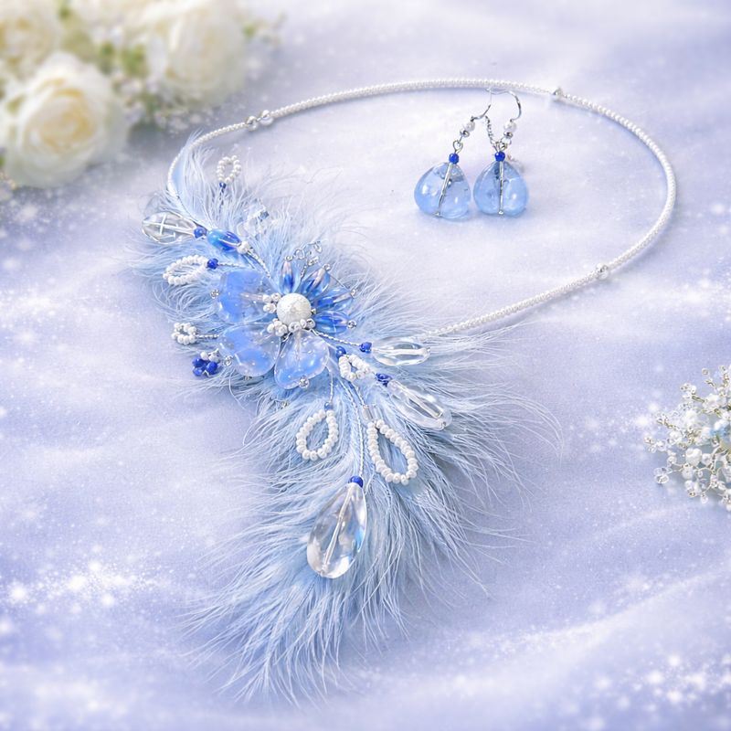 Elegantní ručně vyráběný náhrdelník s jemnými květy, peříčky a perličkami v modro-bílé barevné kombinaci je výrazným, ale stále velmi ženským doplňkem. Dominantní květinový motiv je umístěn blíže ke krku, kde krásně vynikne v dekoltu. Každý detail je pečlivě zpracován s důrazem na lehkost a harmonii.