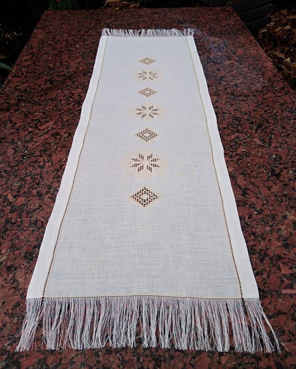 Vianočný obrus je ručne vyšívaný technikou výrez a hladkovanie na bavlnenom plátne maslovej farby stálofarebnými bavlnkami. Vzor je inšpirovaný slovenskou ľudovou výšivkou.