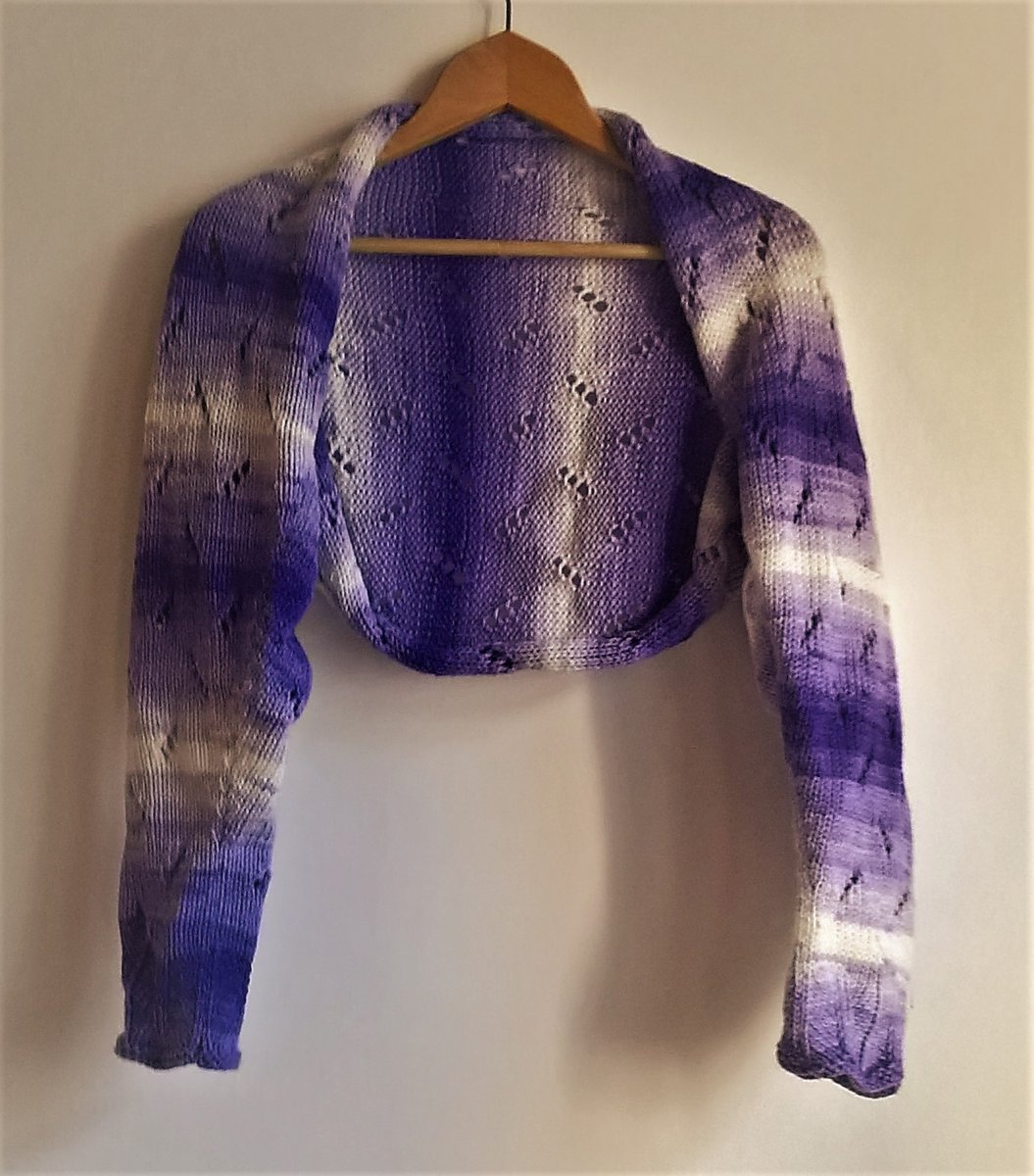 Jsou pletené krajkovým dírkovým vzorem ze středně silné příze, okraje rukávu jsou pletené zoubkovým vzorem. Zadní část je ponechaná volně, ohorní a spodní okraj jsou mírně zarolované. Materiál 100% akrylová velmi měkká příze, barva bílá a několik odstínů fialové