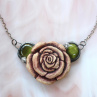 Výrazný náhrdelník romantického vzhledu je vyroben technikou tiffany (měkké pájení, cínování) z mnou zhotoveného keramického střepu, ze zelených kočičích očí a z broušených čirých swarovski korálků. Celý přívěsek včetně závěsných oček má rozměry 8,5x5,2cm a je zavěšen na 41,5cm dlouhém řetízku s karabinkou. Patinováno, ošetřeno antioxidantem.