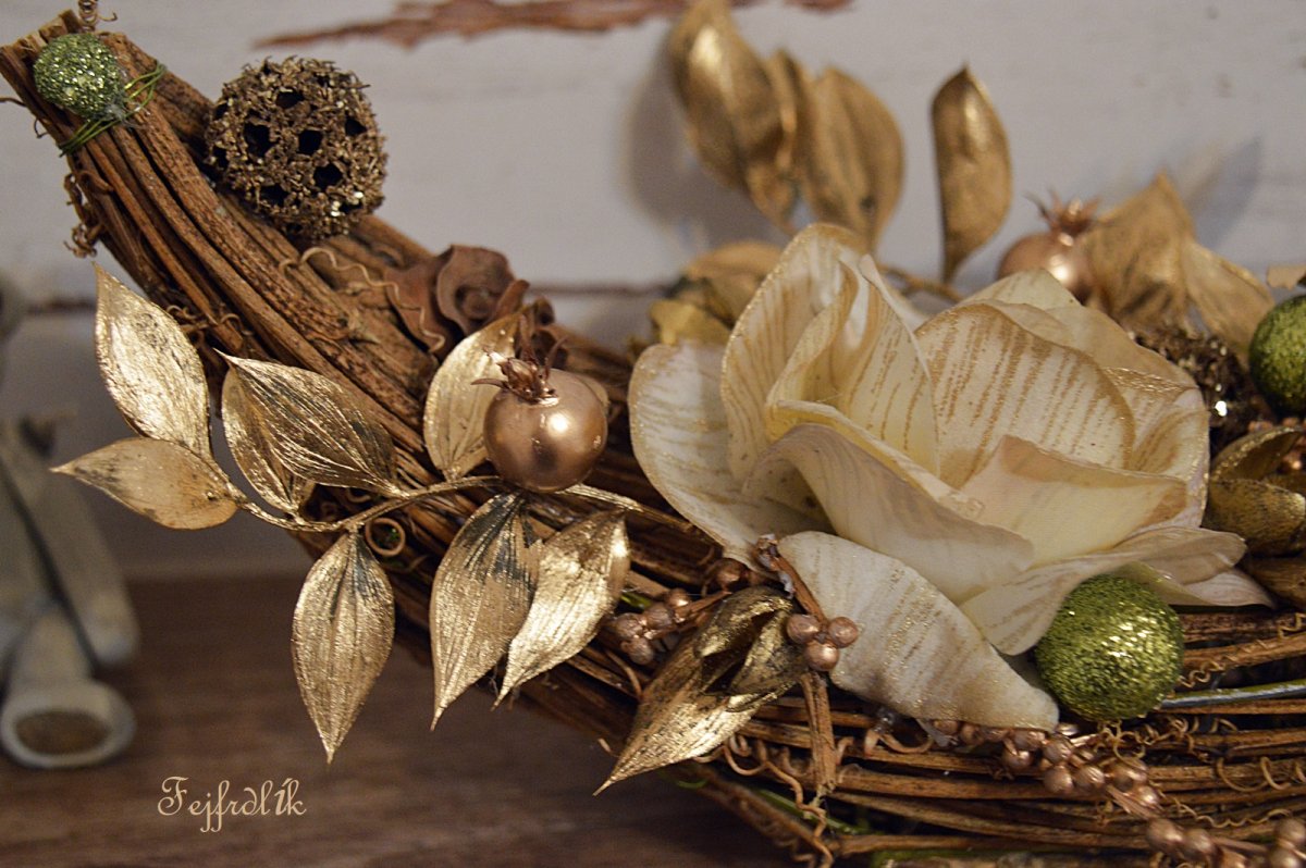 Proutěná dekorace s krásnou látkovou růží , zlaceným ruskusem, umělými bobulkami a zlacenou sušinou.