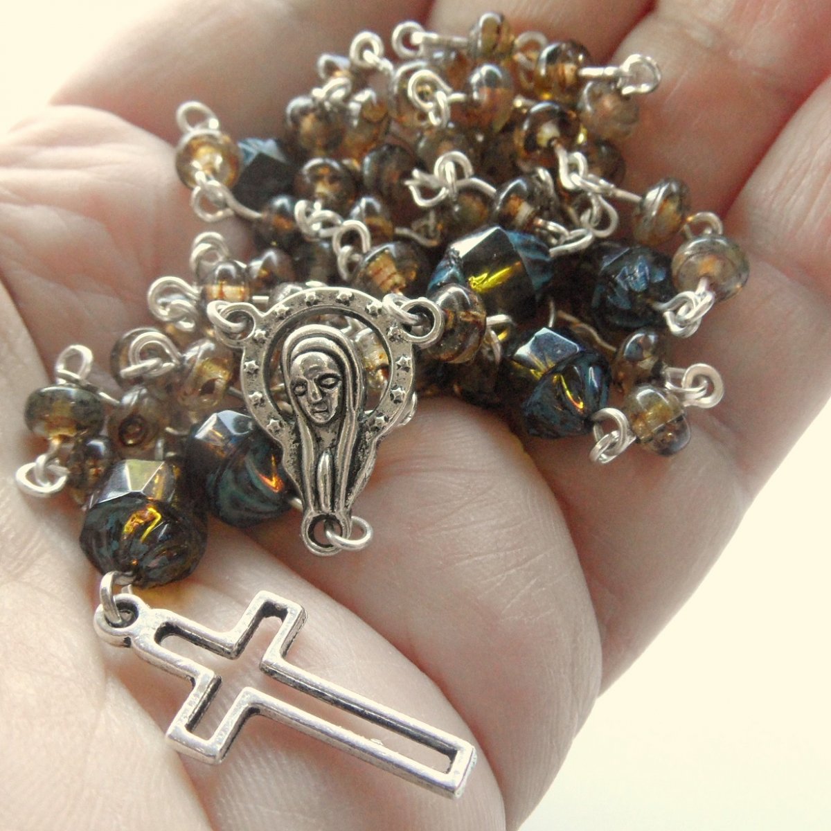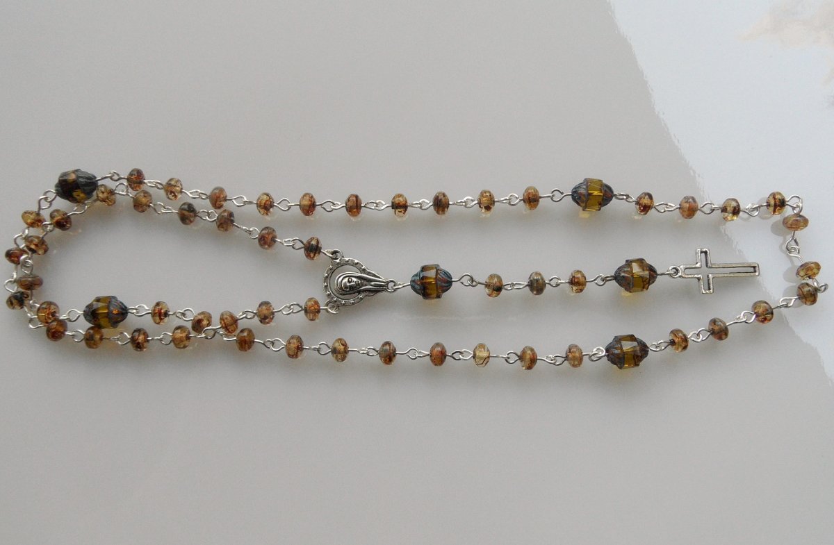 Ketlovaný růženec je vyroben z drobných mačkaných skleněných korálků hnědé barvy s travertinovou úpravou, skleněných korálků průhledné zelenohnědé barvy a kovových komponentů. Obvod růžence je dlouhý 61cm. Přívěsek je dlouhý 8,5cm včetně křížku. Plaketka i křížek jsou oboustranné.