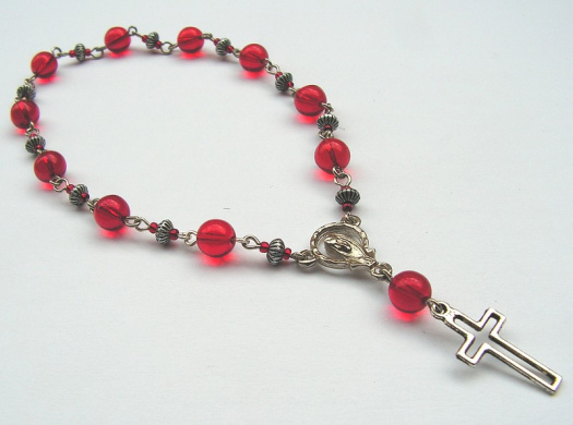 Malý růženec - desátek, vyrobený ze skleněných korálků a rokajlu. Komponenty jsou z bižuterního kovu. Délka cca 20 cm.