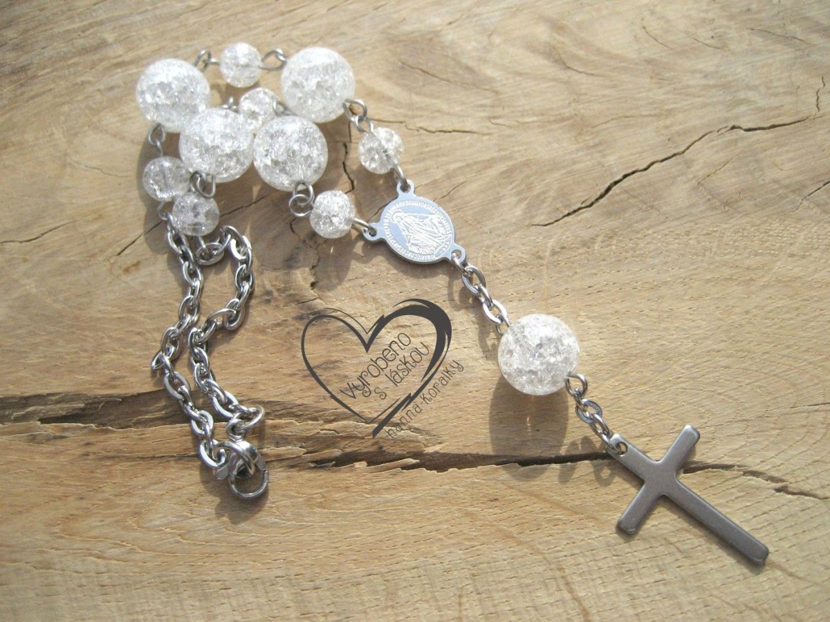 Růženec je vyrobený z minerálních korálků - křišťál a doplněný řetízkem a komponenty z nerezové oceli, délka 18-19cm.