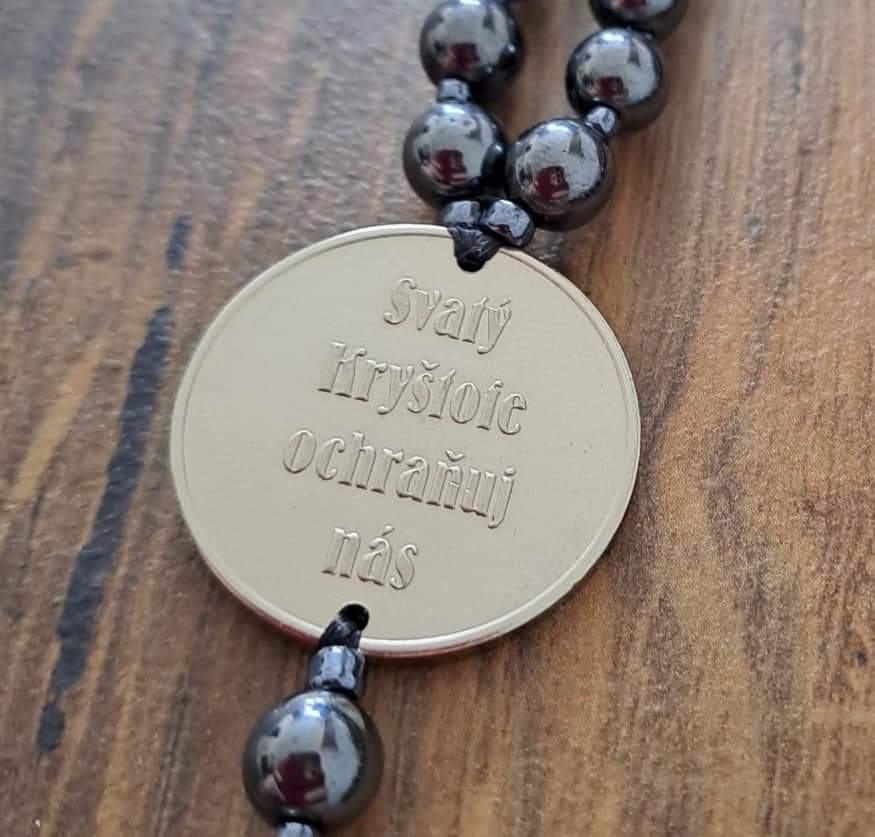 Růženec na pověšení do auta s medailonem patrona řidičů svatým Kryštofem. Medailon je ražená alpaková mince, z jedné strany je motiv sv. Kryštofa, z druhé český nápis Svatý Kryštofe ochraňuj nás. Korálky a kříž jsou z hematitu.