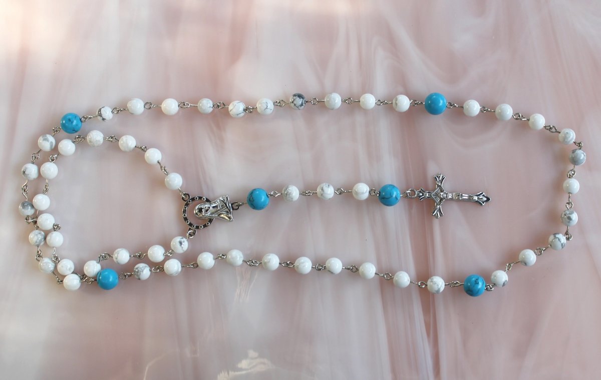 Ketlovaný růženec je zhotoven z tyrkenitových (howlit, magnezit) korálků bílé a tyrkysové barvy a z kovových komponentů. Po obvodu má délku 68cm, přívěsek je 9,5cm dlouhý včetně křížku.