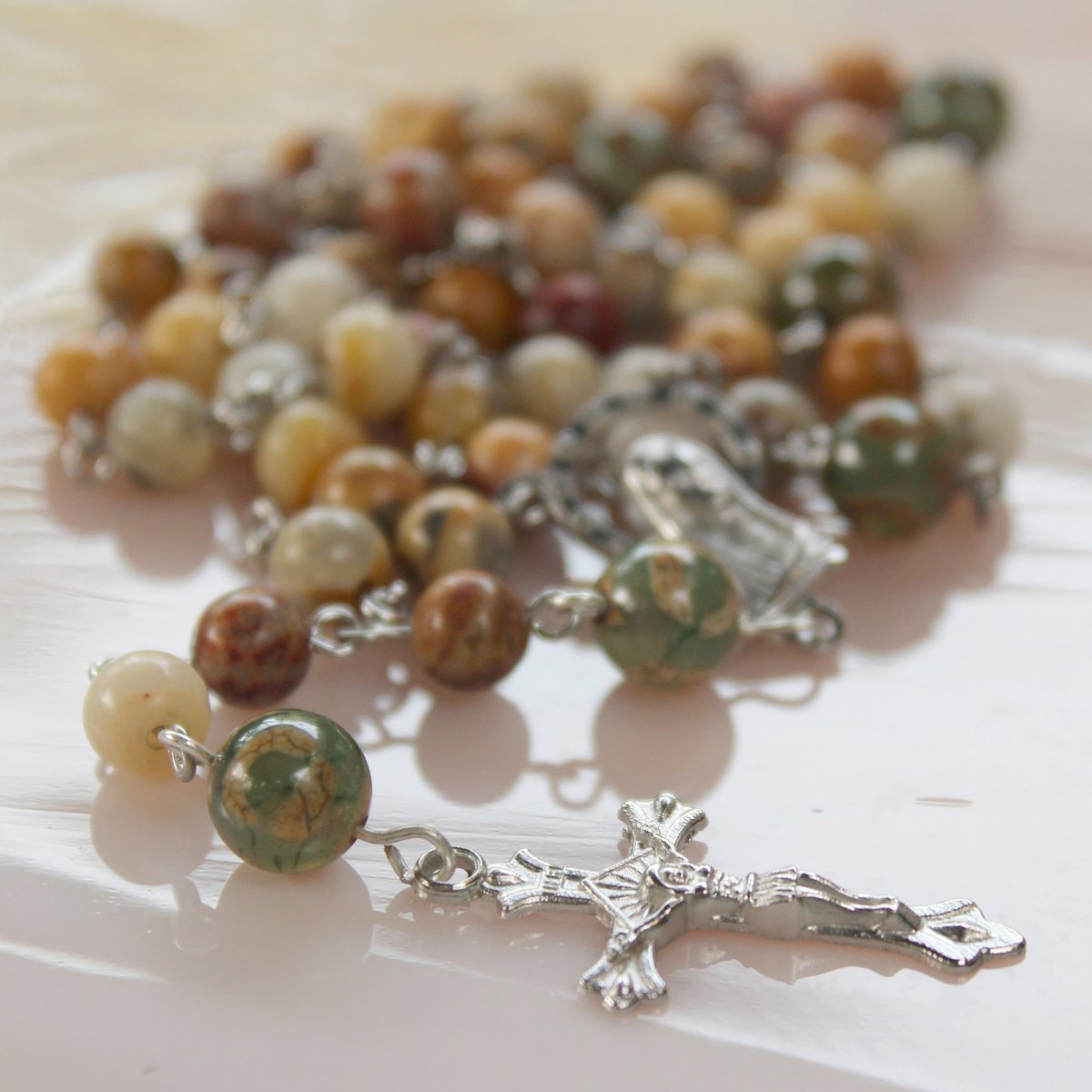 Ketlovaný růženec je zhotoven z kamínků žlutého achátu, tibetského achátu Dzi a z kovových komponentů. Po obvodu má délku 67cm, přívěsek je 9,5cm dlouhý včetně křížku.