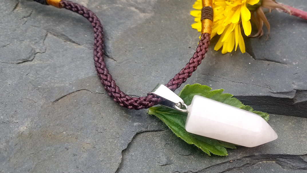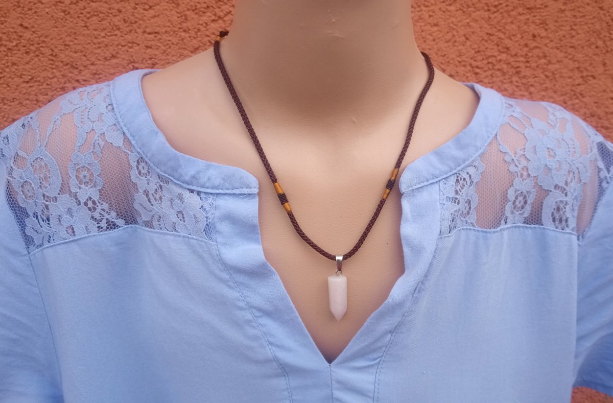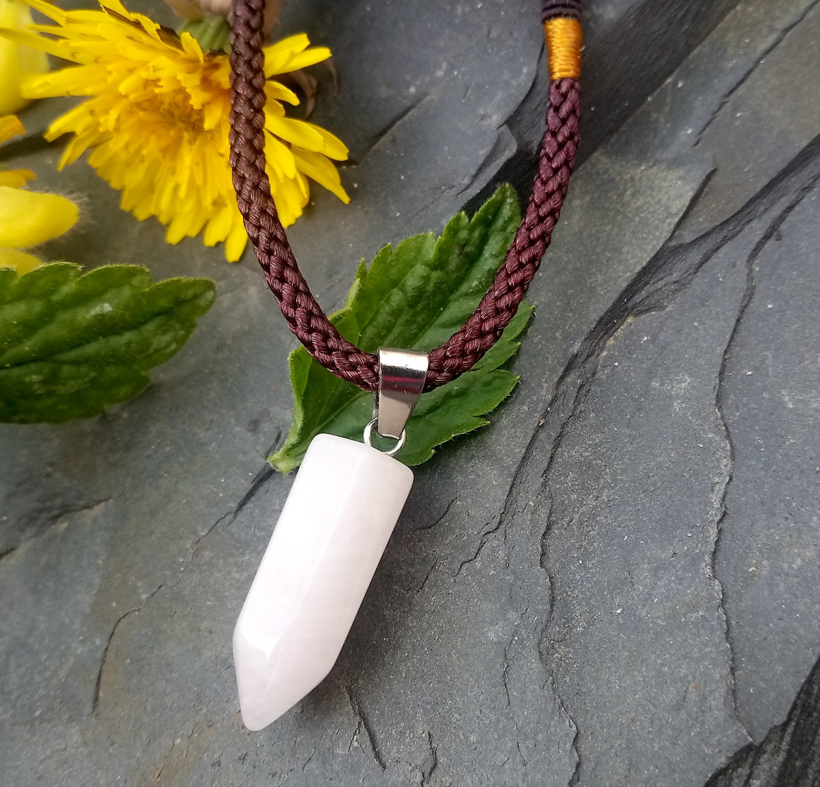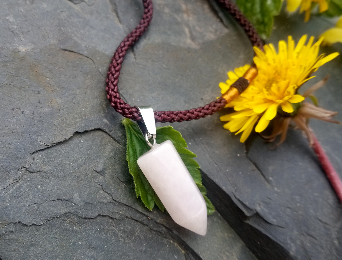 Broušený růženín kuželovitého tvaru se špičkou zavěšený na hnědém provázku s nastavitelnou délkou zdobený dvěma korálky růženínu o průměru 4 mm.