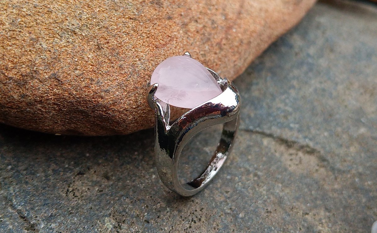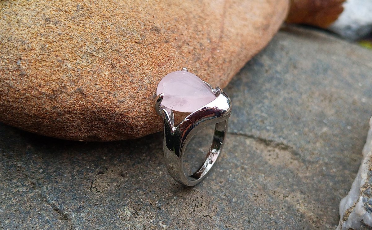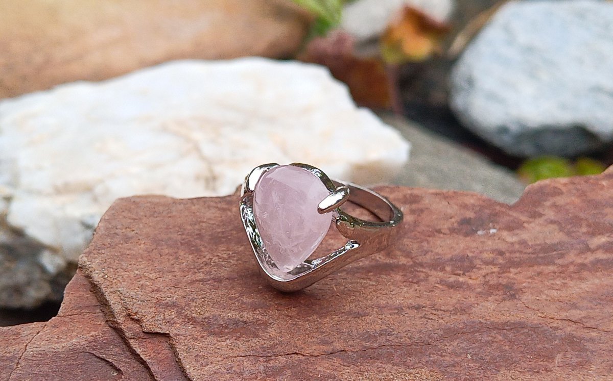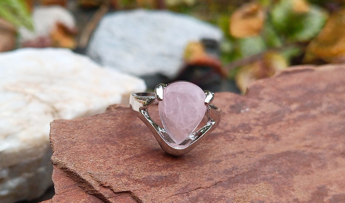 Růženín ve tvaru kapky o velikosti cca 13x10 mm v elegantním postříbřeném prstýnku. Růženín je kámen lásky