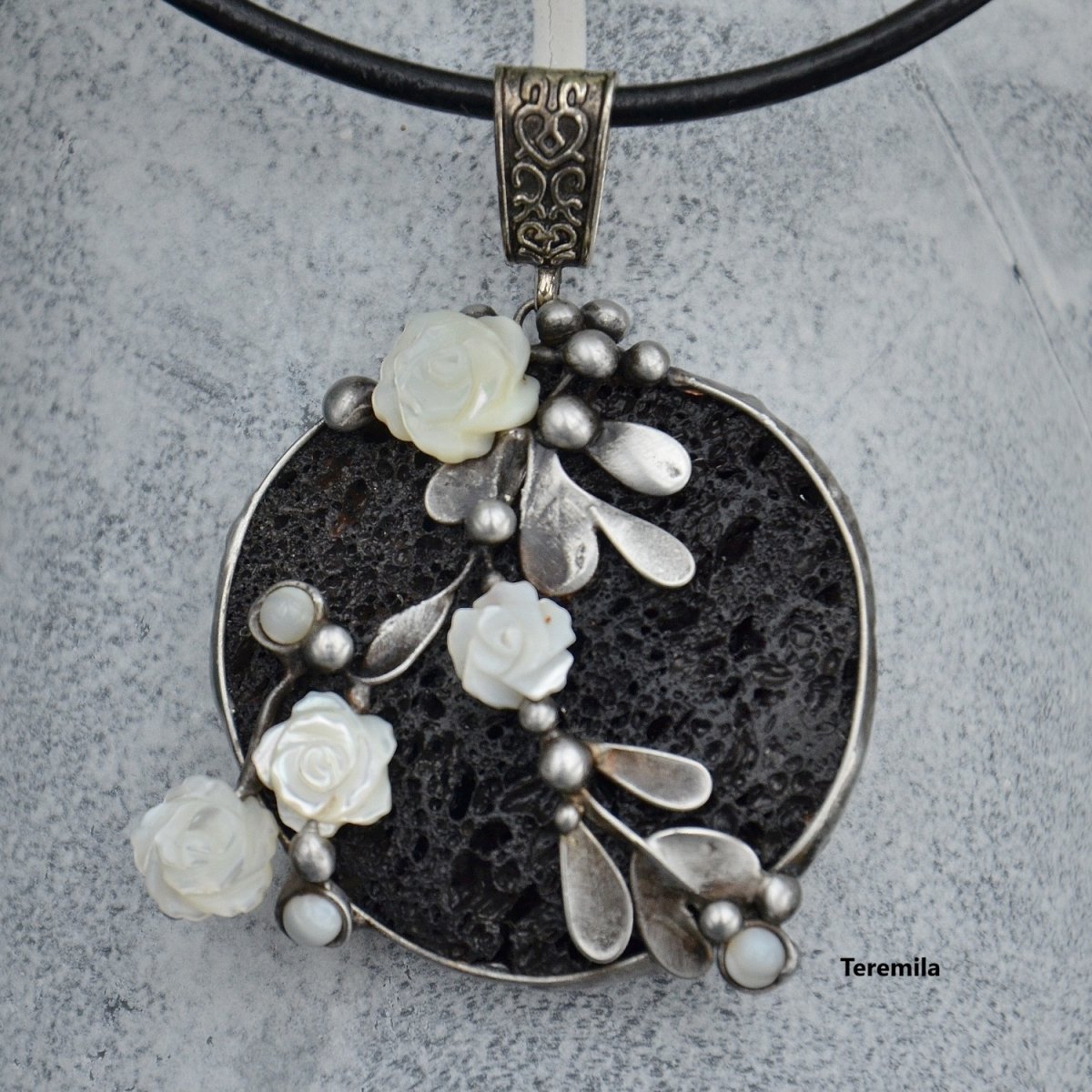 Celý šperk je veliký 7 x 5 cm. Je zavěšen na černé kůži o průměru 3 mm, délky 45 cm s prodlužujícím řetízkem.