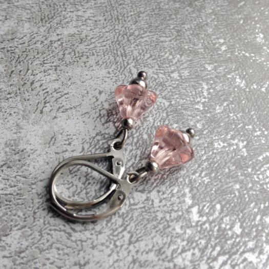 Drobné náušnice se skleněným růžovým zvonečkem. Uzavíratelné zapínání, celkové délka 3 cm. Všechny komponenty jsou z nerez oceli - vhodné i pro alergiky