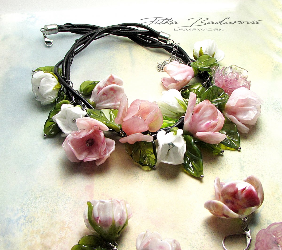 Náhrdelník plný květů ze skla, navlečených na kůži.Kovové komponenty chirurgická ocel.