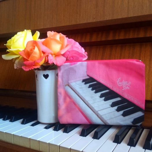 Hudební látková kapsička/taštička/pouzdro je ušita z bavlněného panelu s vyobrazením růžového klavíru. Zadní strana taštičky je z barevné látky se vzorem chevronu, podšívka je z pastelově žluté látky s puntíčky. Zapínání na malinový zip. Šířka je asi 19 cm, výška 14 cm.