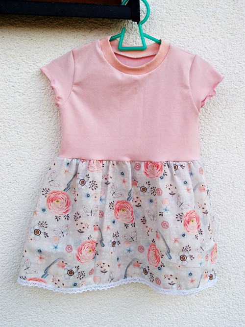 Dívčí šaty. Horní díl je z pružného bavlněného úpletu s elastanem v pudrově růžové barvě. Sukýnka šatiček je z mušelínu s motivem ptáčků a růží. Na dolním lemu je bavlněná krajka. Šatičky jsou vzdušné, příjemné na léto.