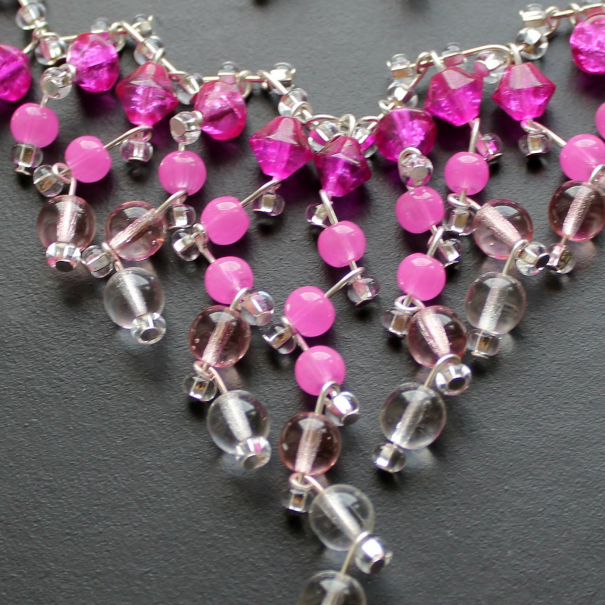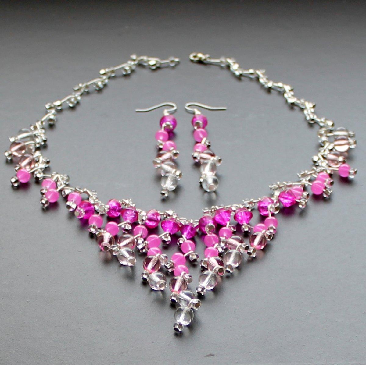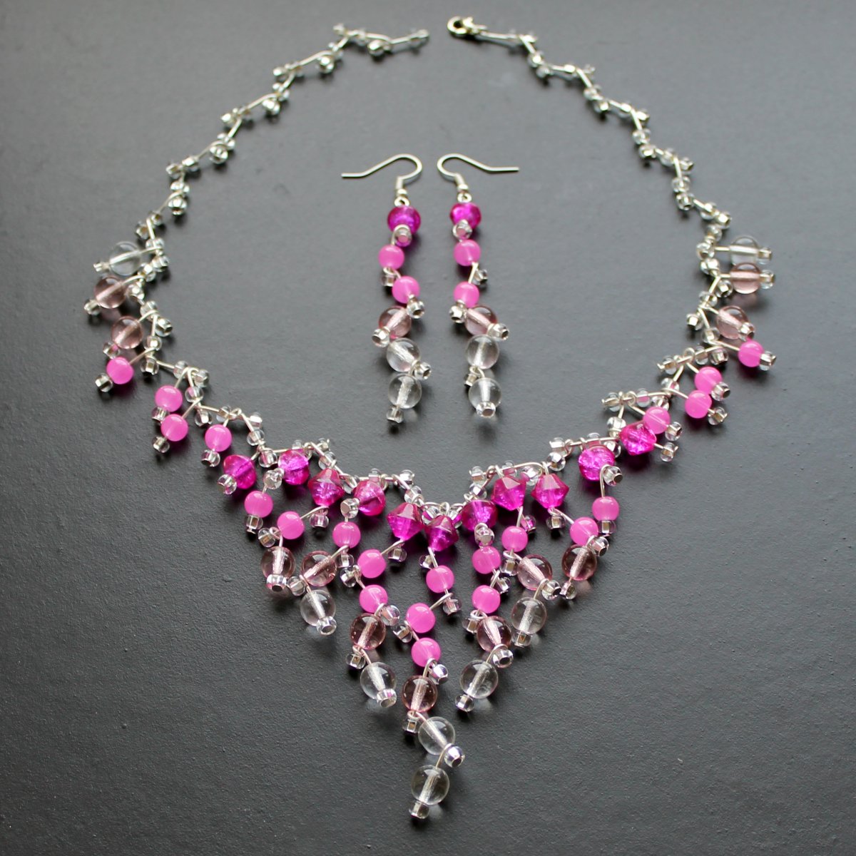 Náhrdelník a náušnice z růžových mačkaných a praskaných korálků a čirých mačkaných a rokailových korálků. Velikost čiré kuličky je cca 0,7 cm.