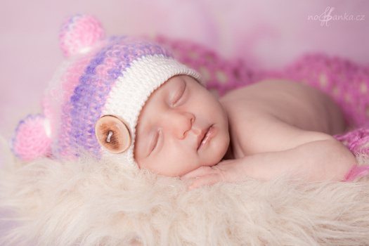 Pletená čepička z růžovo fialkovo bílého melírku s kočičími oušky je obháčkována bílým lemem. Na lemu má velký dřevěný knoflík pro ozdobu. Materiál pro výrobu jsem použila měkkoučký akryl. Čepička je určena hlavně pro ateliérové focení miminek.