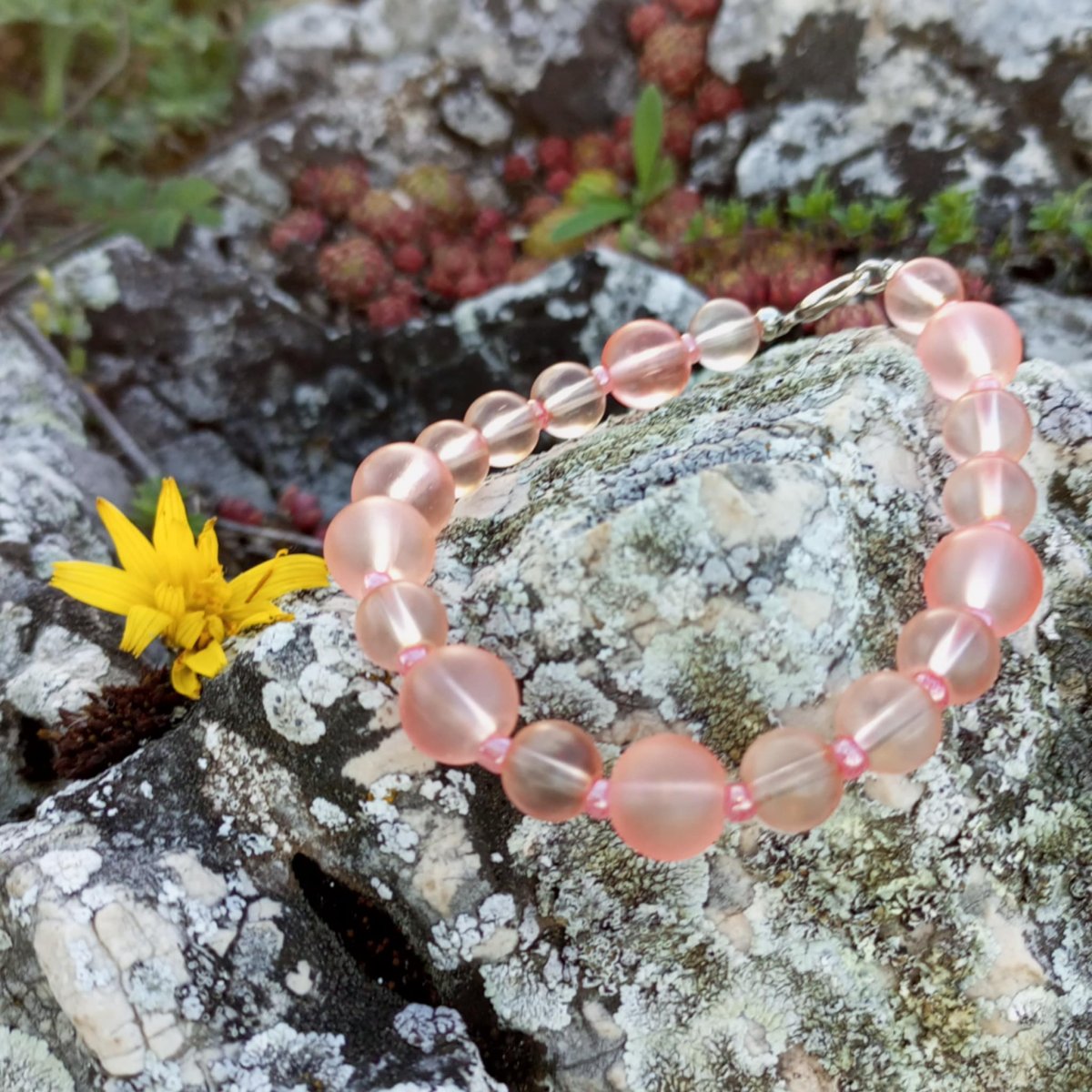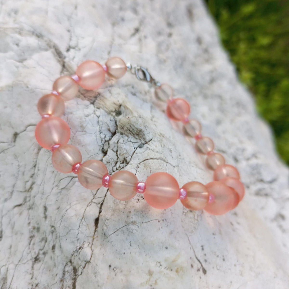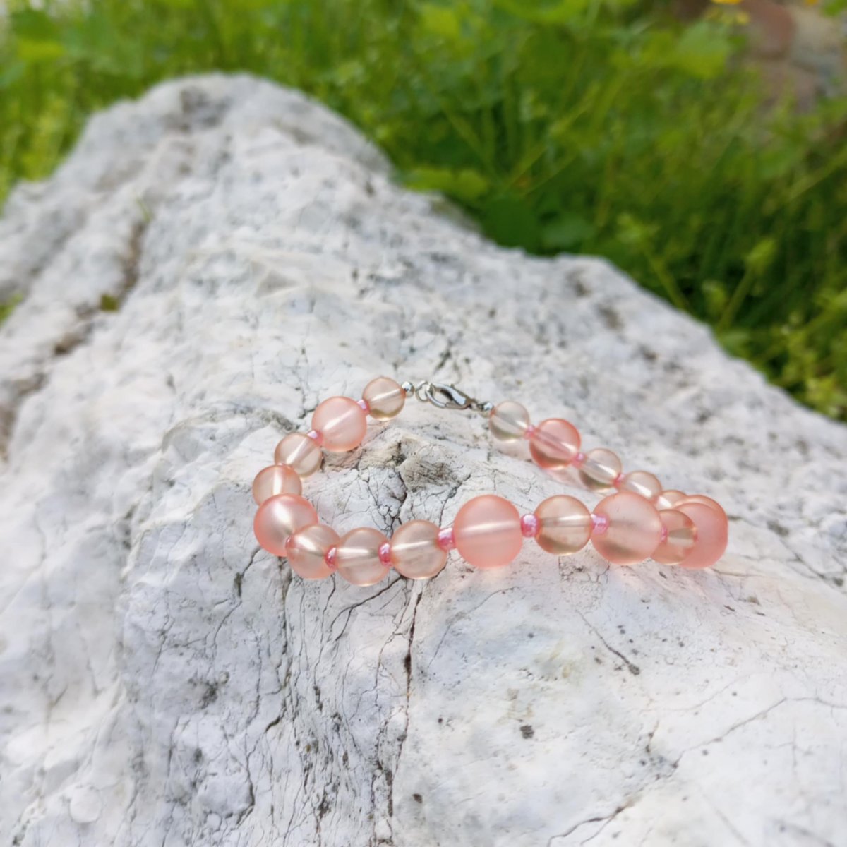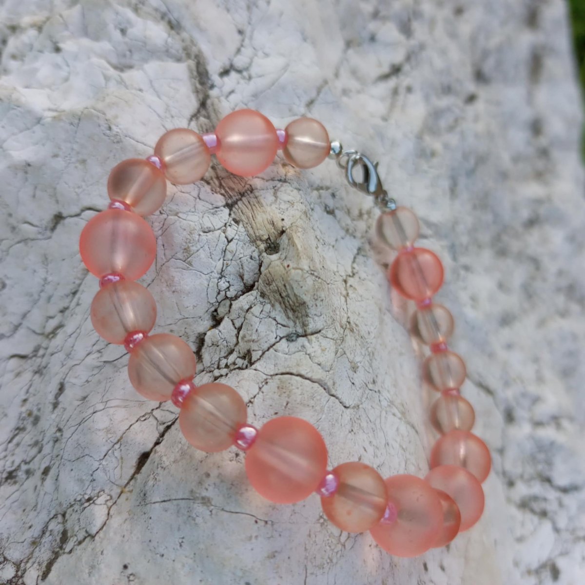Náramek z růžových skleněných korálků a rokajlových korálků.