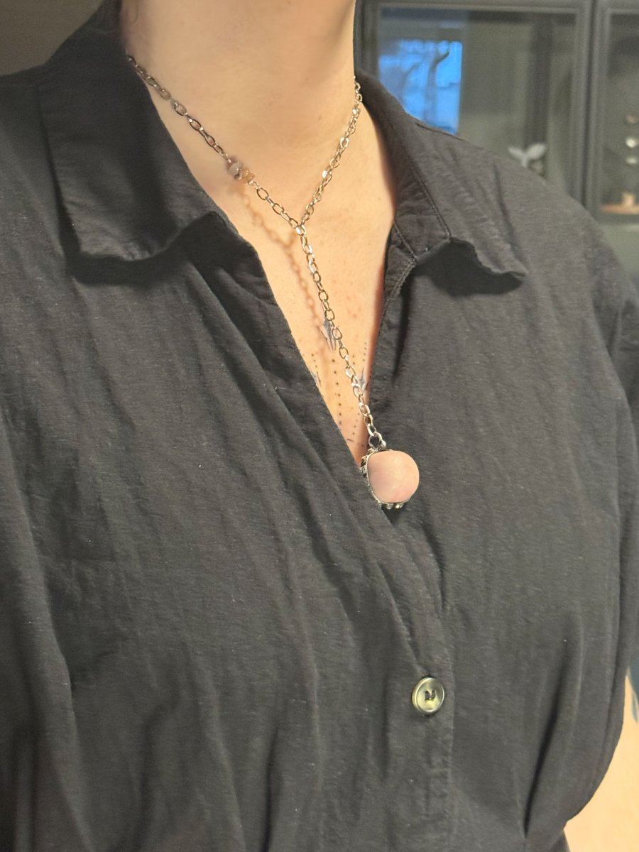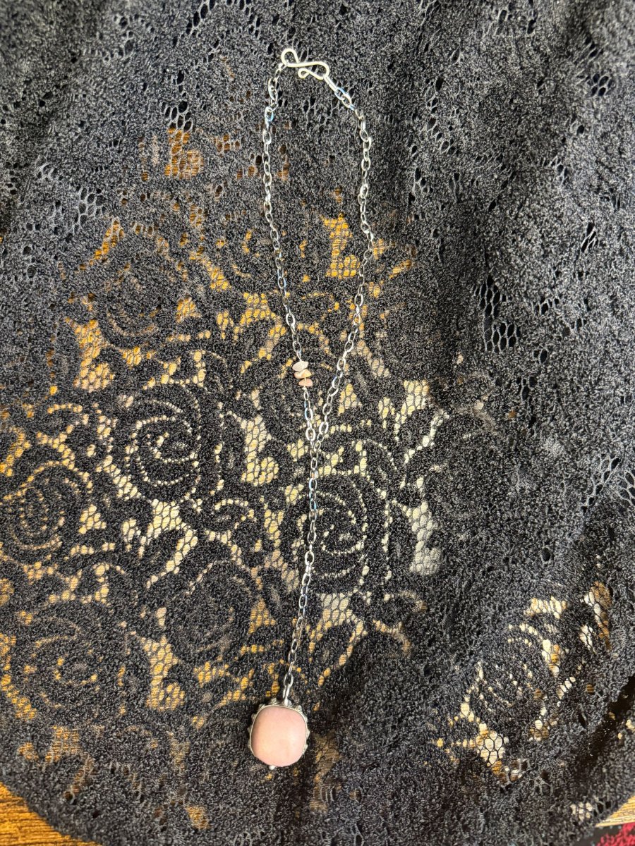 Dlouhý náhrdelník s Andským růžovým opálem. Do řetízku jsou vloženy malé kousky růženínu.