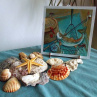 Obrázek na sololitové destičce, rozměr 16x16 cm, vytvořený technikou decoupage - motiv ryby, udice a podběráku .