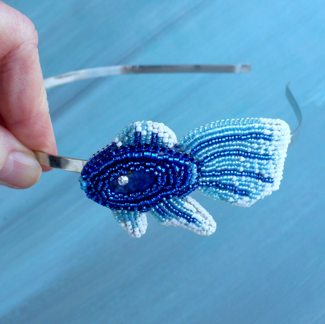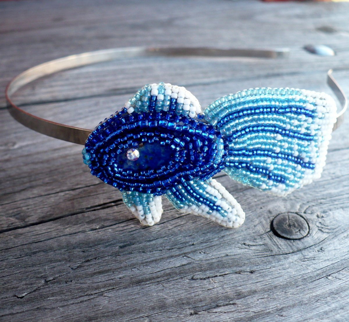 Tělo rybičky tvoří kabošon lapis lazuli. Očičko je Swarovski našívací Xirius Lochrose. Pro výšivku byl použit japonský rokail TOHO v barvě kobaltově modrá, světle modrá s listrem a bílá. Šito nití nymo. Podšito alcantarou šedé barvy.