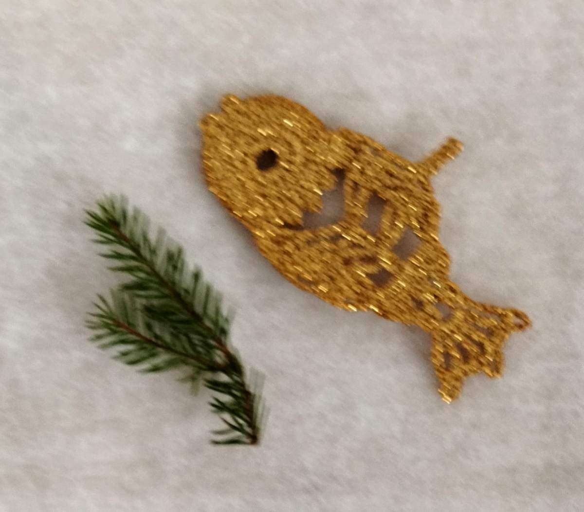 Rybka je uháčkovaná z vysoce kvalitní metalizované zlaté efektní příze německé výroby. Je pečlivě naškrobená, aby krásně držela tvar. Velikost rybky je 5cm x 10cm. Je ideální jako ozdoba na vánoční stromeček, věnec, záclonu nebo jako originální přízdoba k dárkům. Také ji můžeme volně položit na vánoční stůl. Fantazii se meze nekladou.