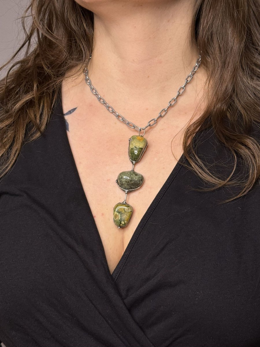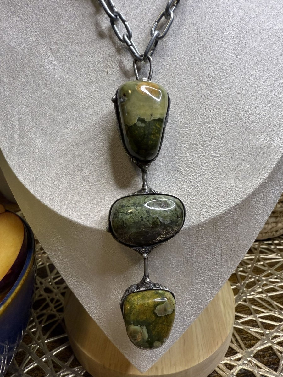 Náhrdelník z RYOLITU. Tři kameny spojené bezolovnatým cínem do výrazného šperku s krásnou kresbou. Černá patina obroušena do starostříbrné barvy. Vše ošetřeno antioxidačním olejem a vyleštěno karnaubským voskem.