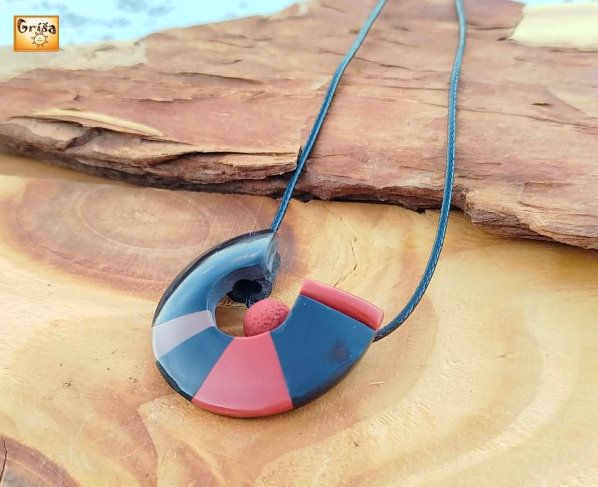 Zavěšeno na kulaté šňůrce černé barvy se zapínáním na karabinku, délka 45 cm + 6 cm prodlužovací řetízek.