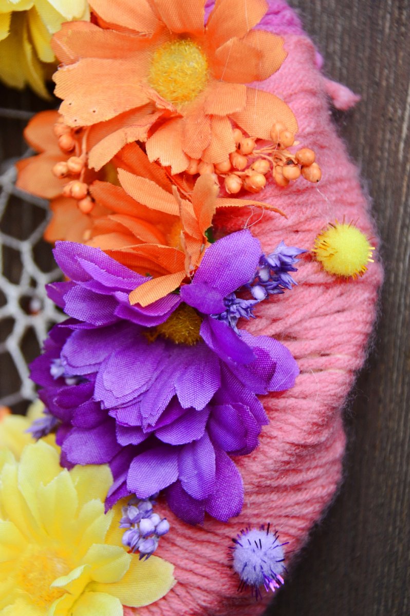 Proutěný věneček 20 cm omotaný vlněnou přízí čtyř barev, doplněný umělými květinami kopretin a sušinou. Uvnitř s kruhem s korálky s očkem na zavěšení.
